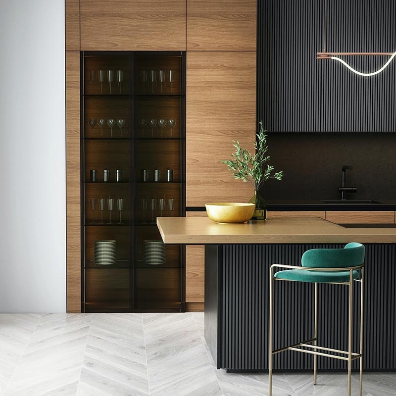 Kitchens are going big in 2024 as trends for the year ahead focus on bold statements. Our kitchens will be taking a dark and moody turn as we embrace warmer materials and colours. Wood with deep grains in walnut shades along with black and heavily-veined marble and porcelain will give our splashbacks and worktops more drama. Highly-textured tiles will also appear to make a statement.