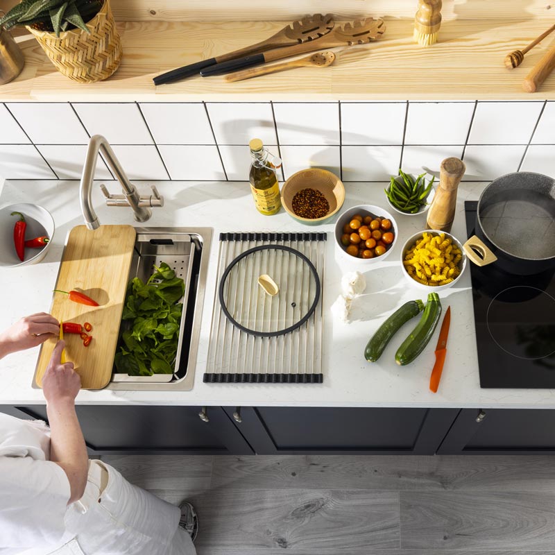 This feeds into another trend for kitchens in 2024 – embracing stress-free design. We’ll be looking for kitchens that are easy to use and clean, to help us save valuable time. With this we’ll see more innovative designs using low-maintenance materials, including double sinks in stainless steel with colanders, boards and racks like the Abode System Sync, for speedy food prep and post-meal clean-ups.